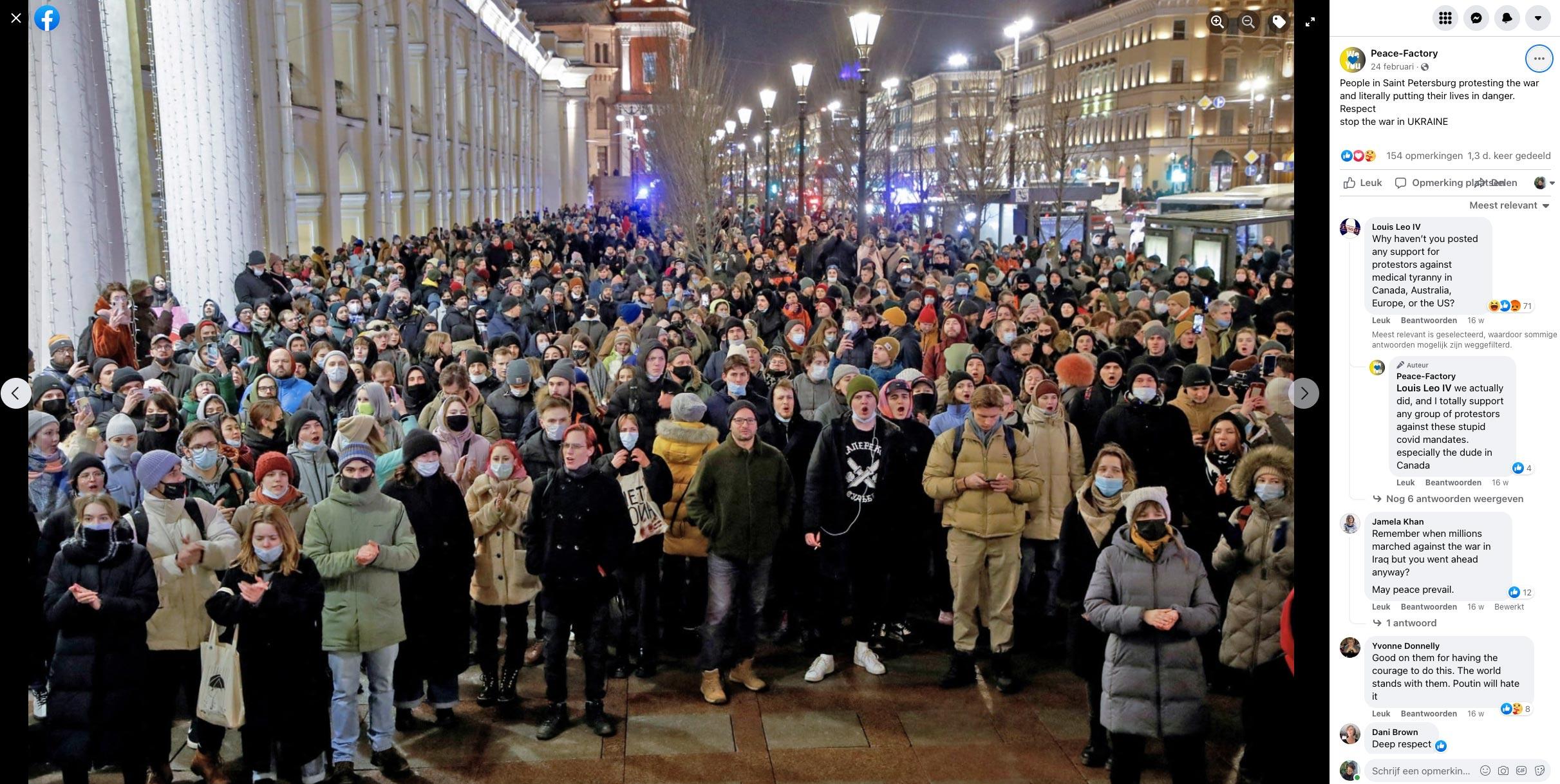 Zowel in het conflict tussen Iran en Irak als in het huidige conflict tussen Rusland en Oekraïne, vallen er langs beide kanten slachtoffers: het ‘gewone volk’ is altijd de dupe. Momenteel overheerst het anti-Ruslandgevoel, maar wat met het grote deel van de Russen dat helemaal niet achter de oorlog staan? Op de Facebookpagina van Peace-Factory zien we een krachtig beeld van mensen die op straat komen in Sint-Petersburg en zo hun eigen leven riskeren.